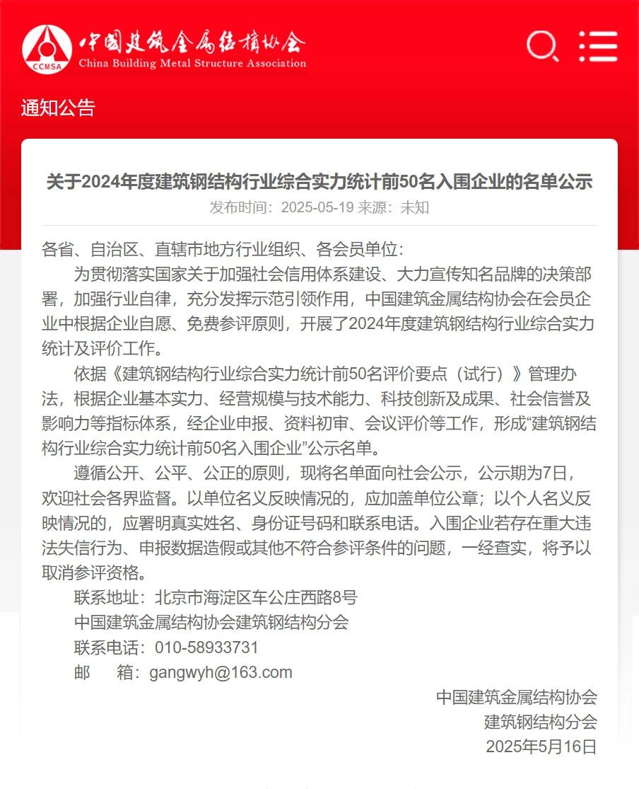 為貫徹落實(shí)國(guó)家關(guān)于加強(qiáng)社會(huì)信用體系建設(shè)、大力宣傳知名品牌的決策部署,加強(qiáng)行業(yè)自律,充分發(fā)揮示范引領(lǐng)作用,中國(guó)建筑金屬結(jié)構(gòu)協(xié)會(huì)在會(huì)員企業(yè)中根據(jù)企業(yè)自愿、免費(fèi)參評(píng)原則,開展了2024年度建筑鋼結(jié)構(gòu)行業(yè)綜合實(shí)力統(tǒng)計(jì)及評(píng)價(jià)工作。依據(jù)《建筑鋼結(jié)構(gòu)行業(yè)綜合實(shí)力統(tǒng)計(jì)前50名評(píng)價(jià)要點(diǎn)(試行)》管理辦法,遵循公開、公平、公正的原則,根據(jù)企業(yè)基本實(shí)力、經(jīng)營(yíng)規(guī)模與技術(shù)能力、科技創(chuàng)新及成果、社會(huì)信譽(yù)及影響力等指標(biāo)體系,經(jīng)企業(yè)申報(bào)、資料初審、會(huì)議評(píng)價(jià)等工作,形成“建筑鋼結(jié)構(gòu)行業(yè)綜合實(shí)力統(tǒng)計(jì)前50名入圍企業(yè)”公示名單。